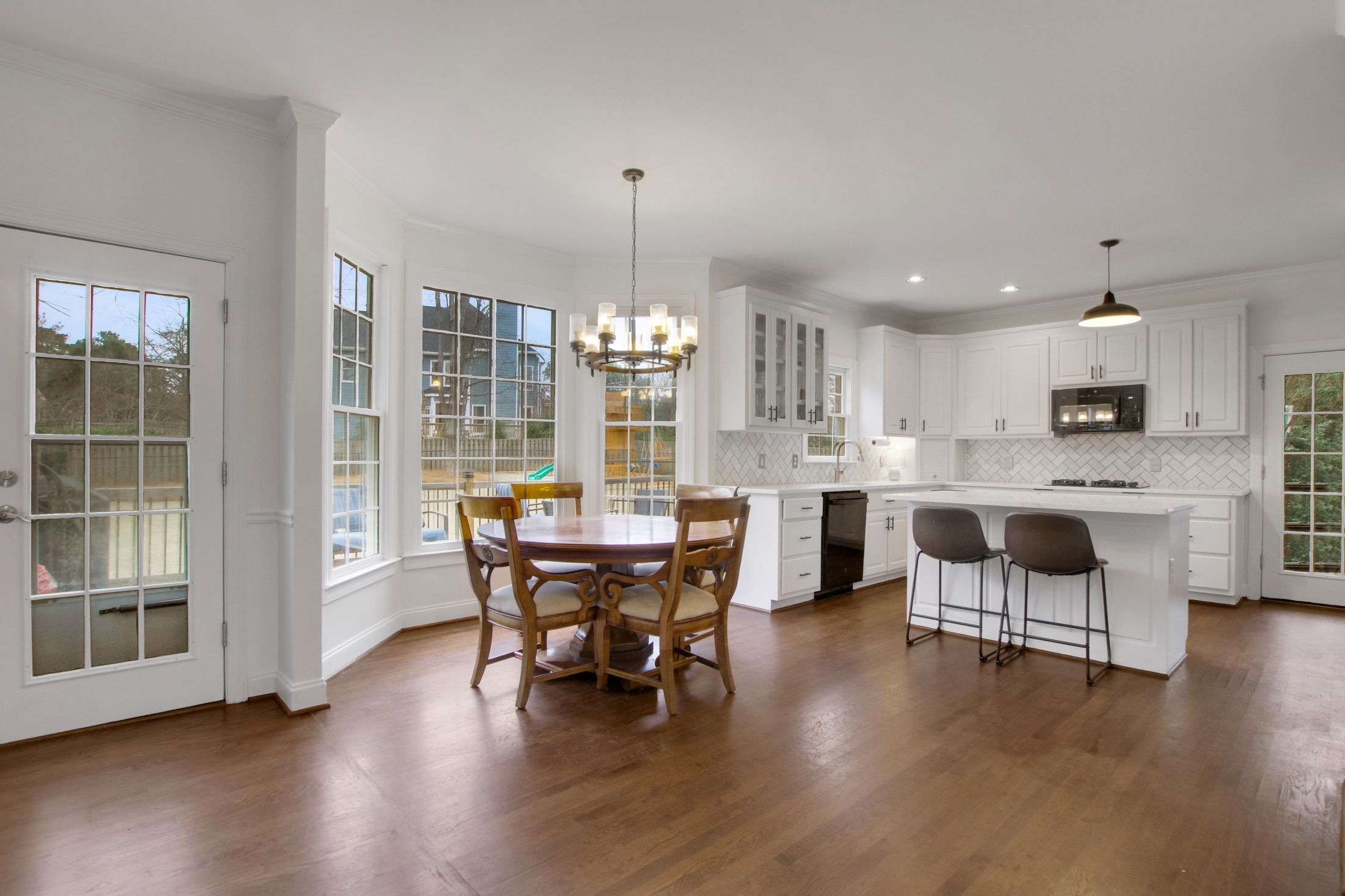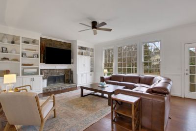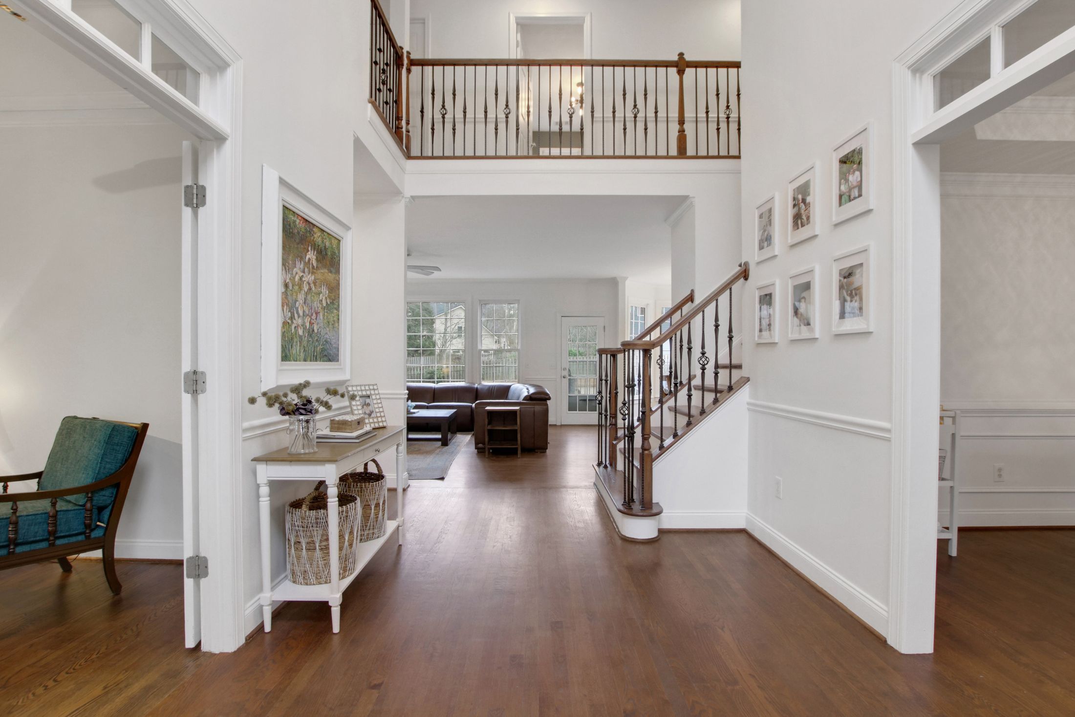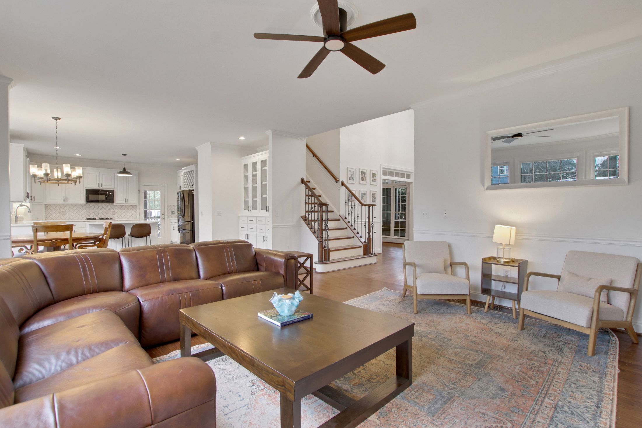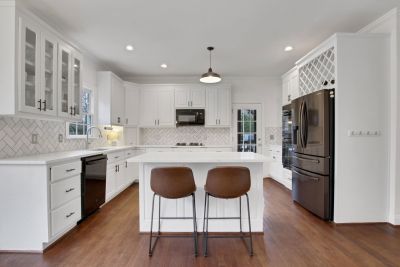 The updated kitchen features crisp white cabinetry, gorgeous new quartz countertops, and flows seamlessly into the family room with beautiful wood floors throughout the main level.
