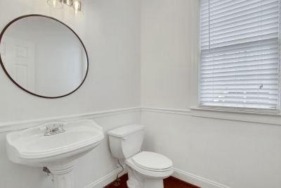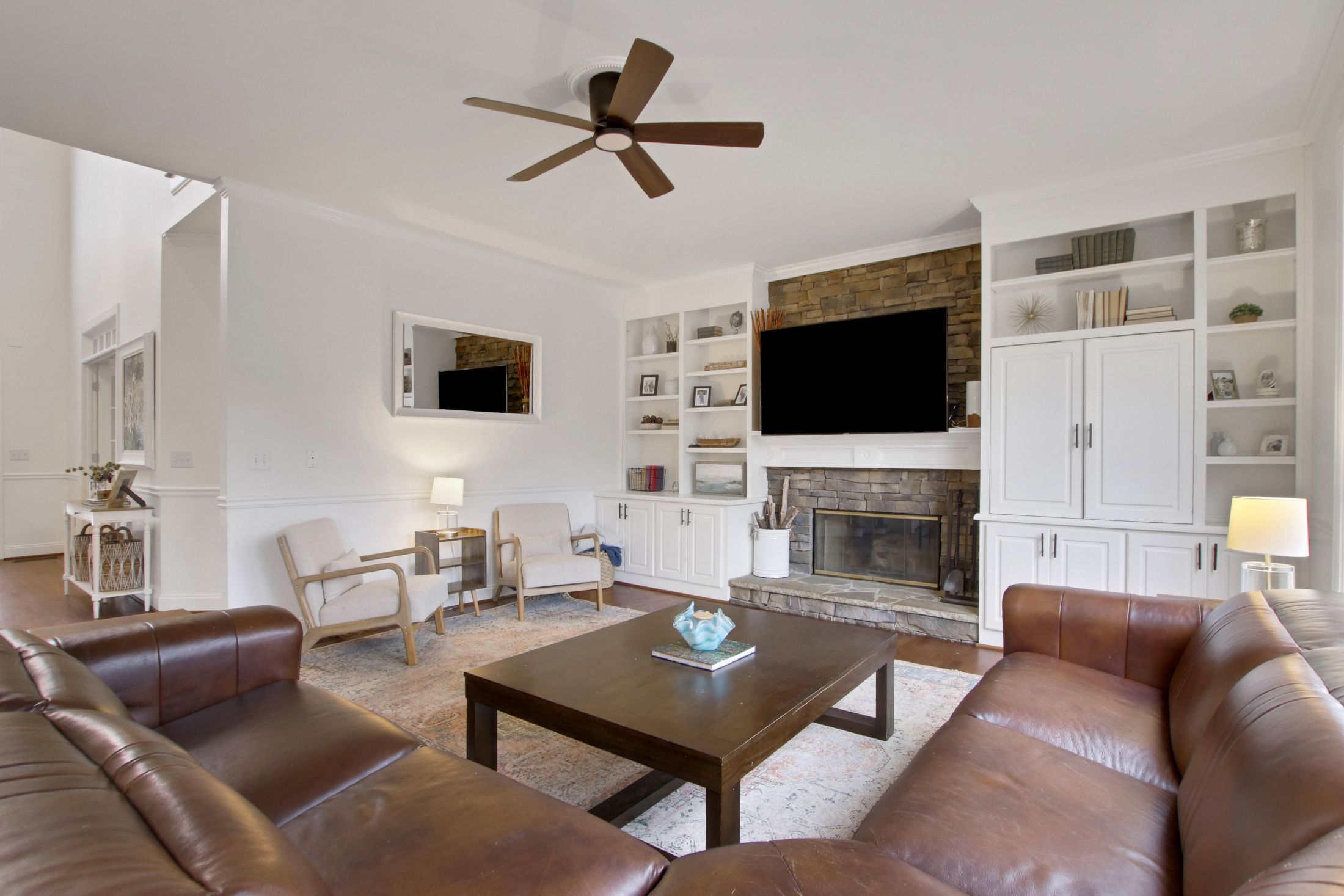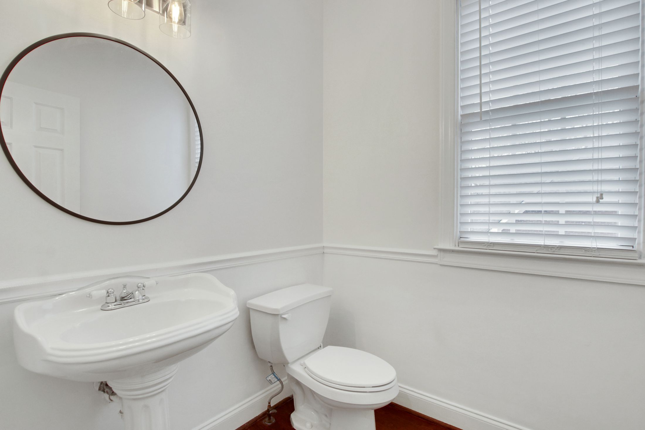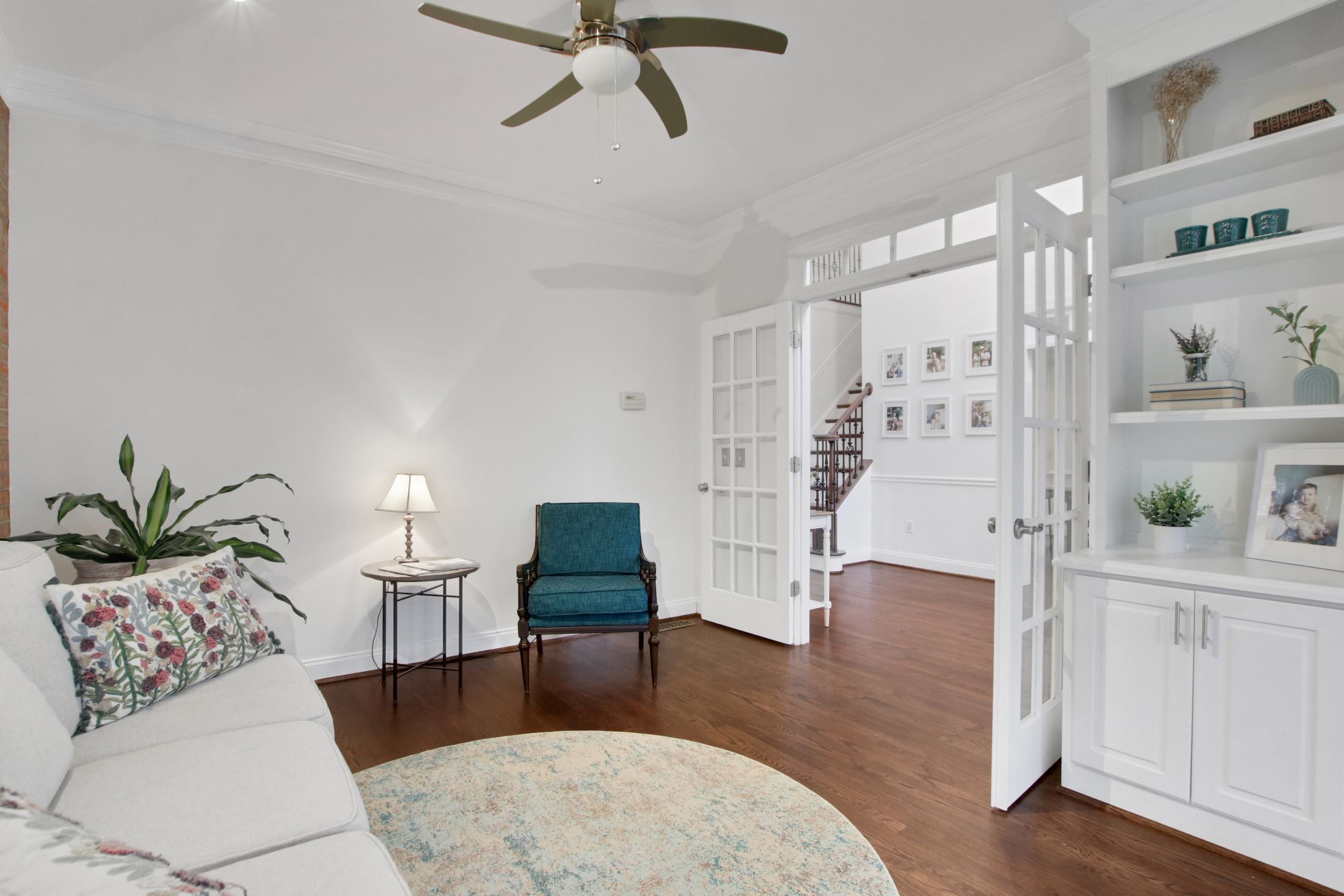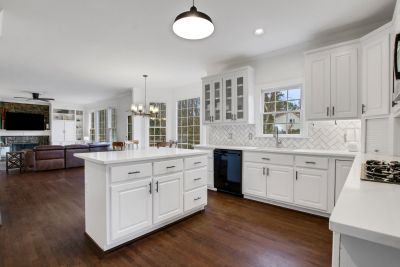 The updated kitchen features crisp white cabinetry, gorgeous new quartz countertops, and flows seamlessly into the family room with beautiful wood floors throughout the main level.