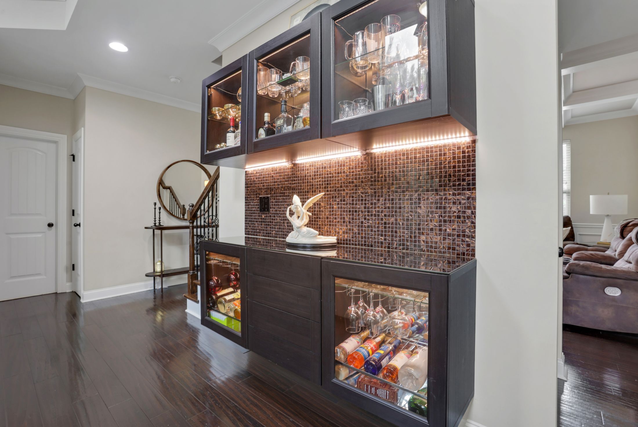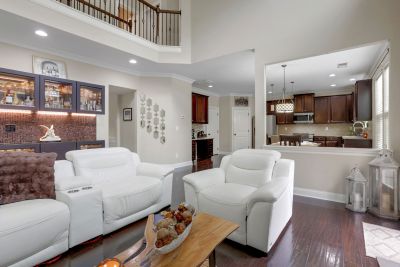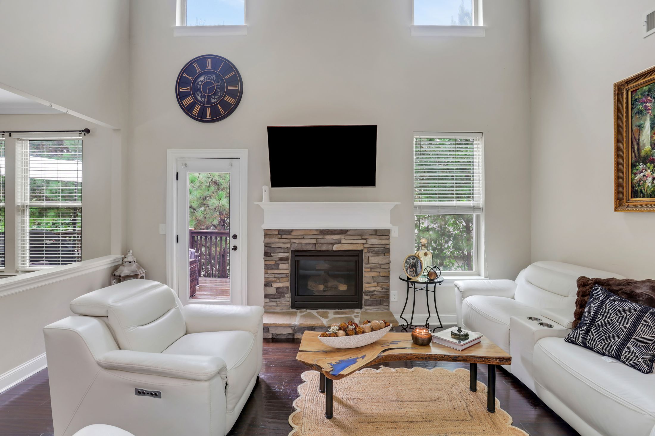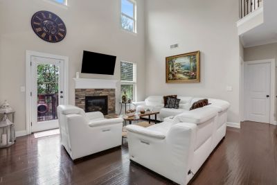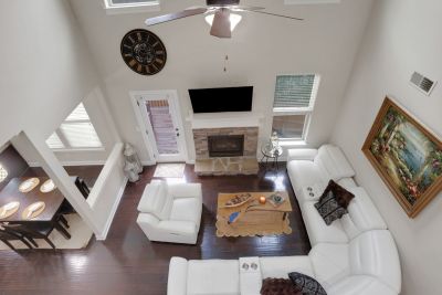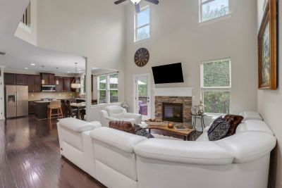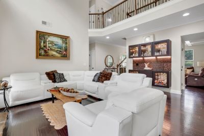 Stunning two-story family room with a stone fireplace and built-in bar area.