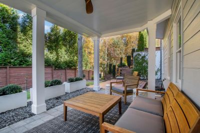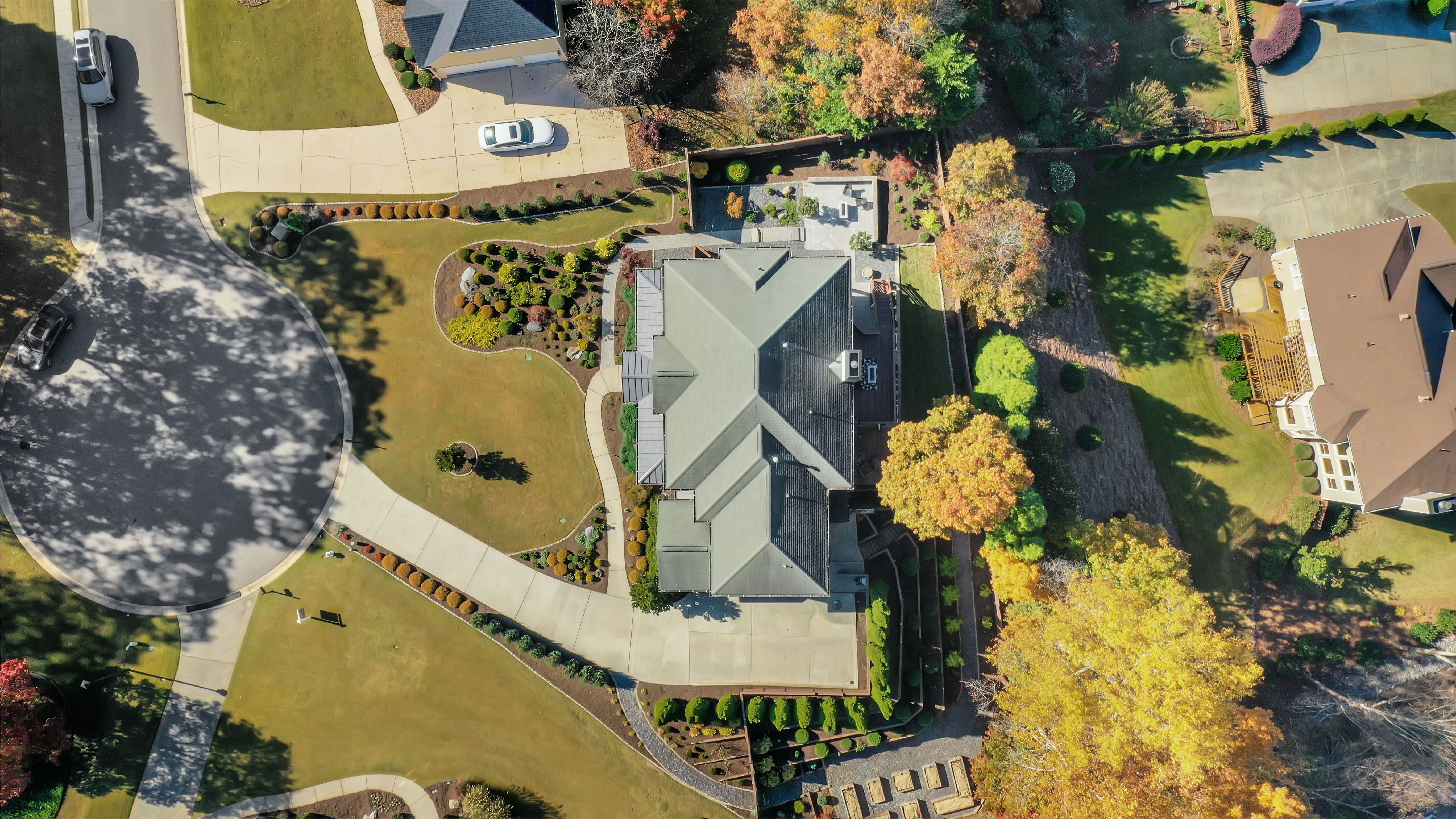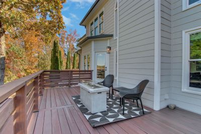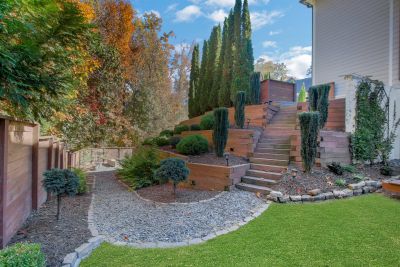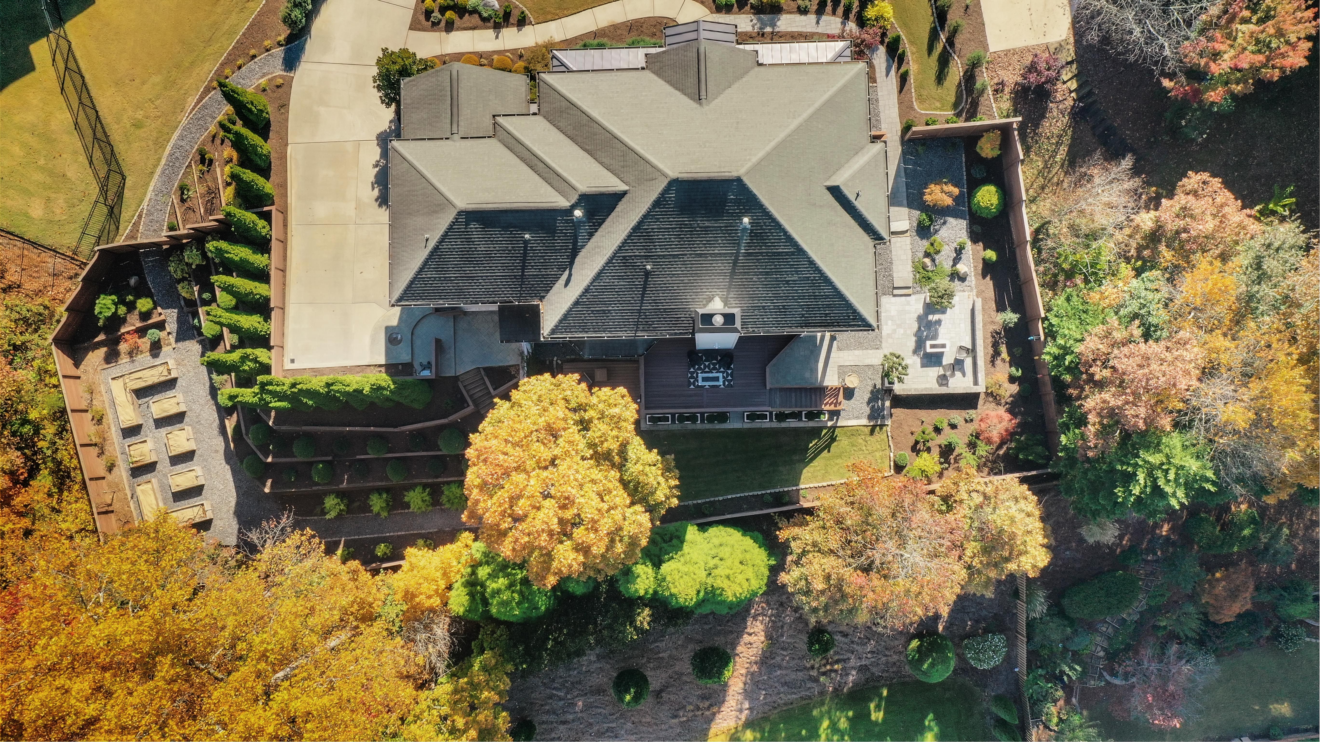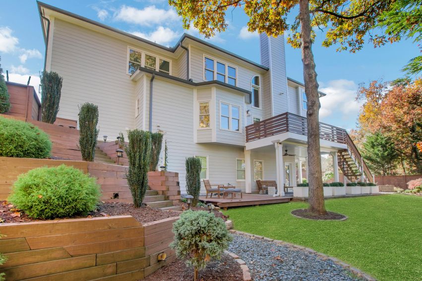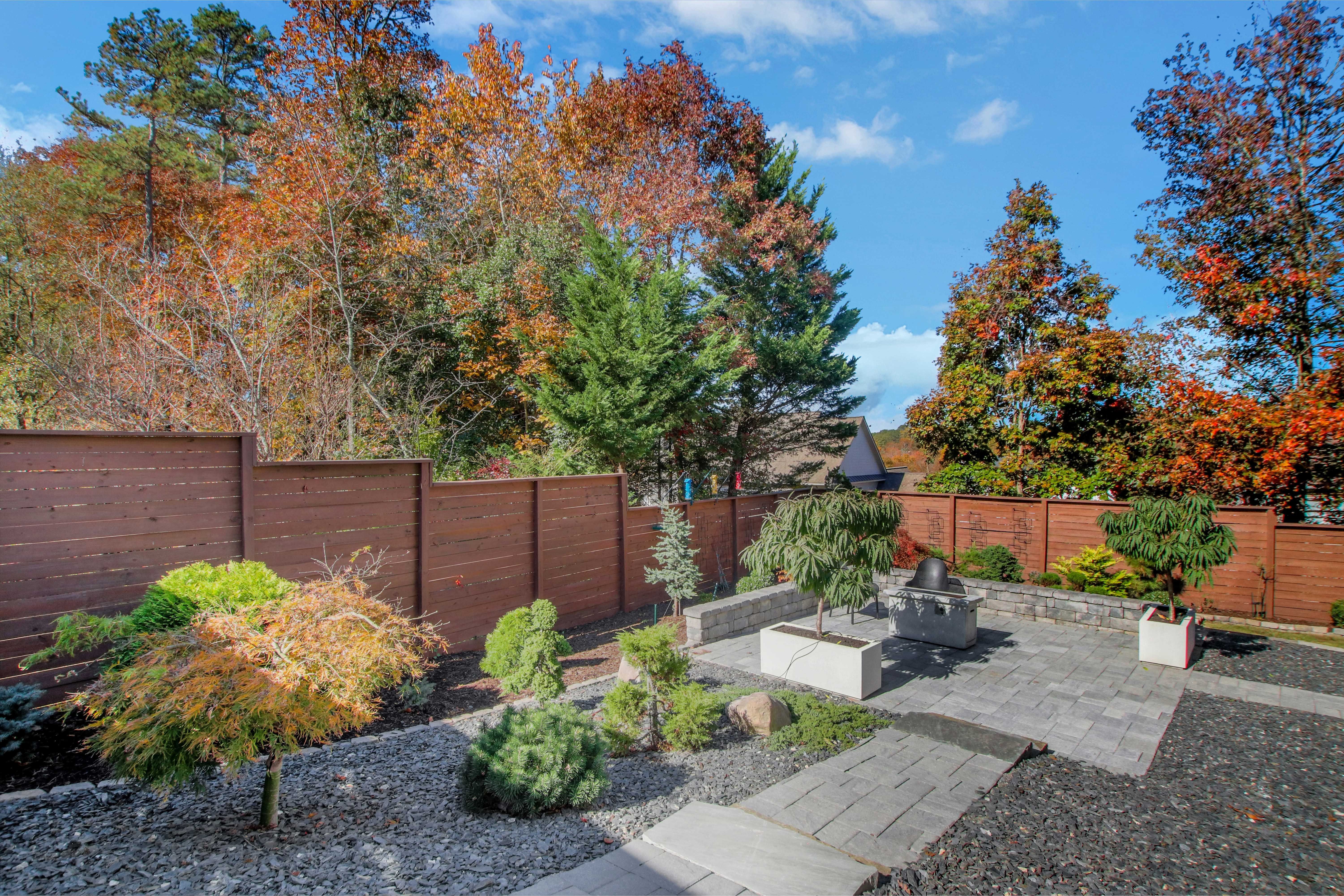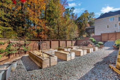 A modern deck with under-decking creates a year-round patio experience, while the paver patio with sitting wall is perfect for fireside evenings. The Japanese-inspired conifer garden features heirloom roses, unique evergreens, a raised-bed vegetable garden, and fruit trees - all maintained effortlessly with smart Wi-Fi drip irrigation and landscape lighting. Permanent Trimlight holiday lighting adds year-round curb appeal at the touch of a button