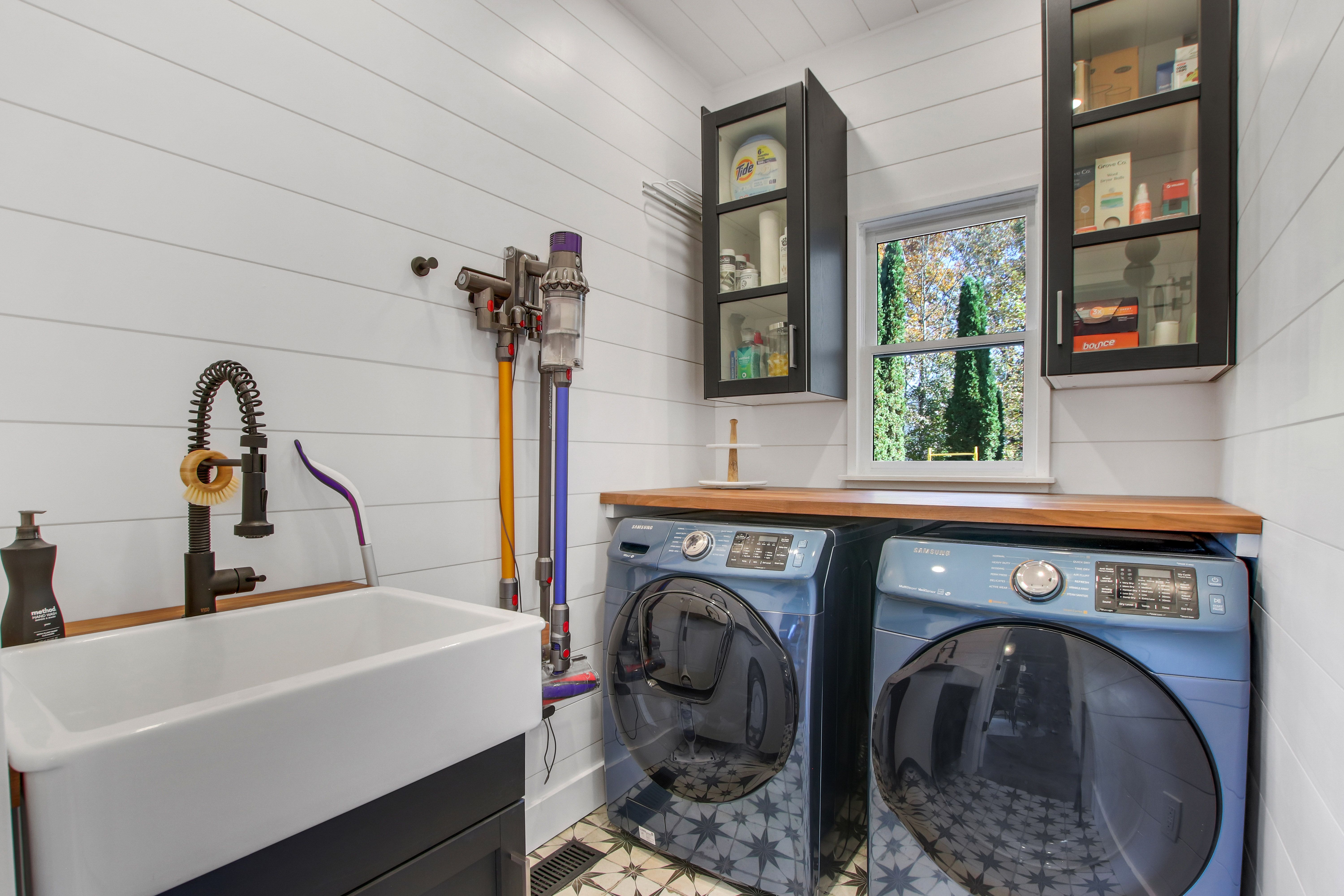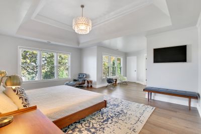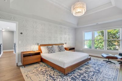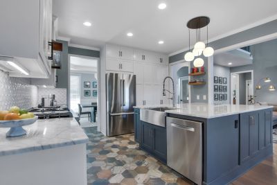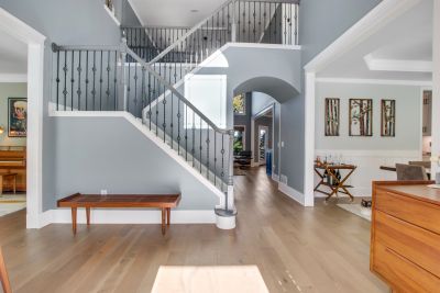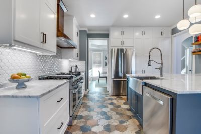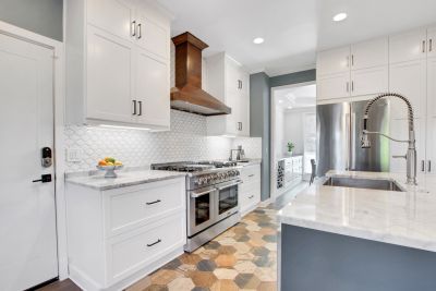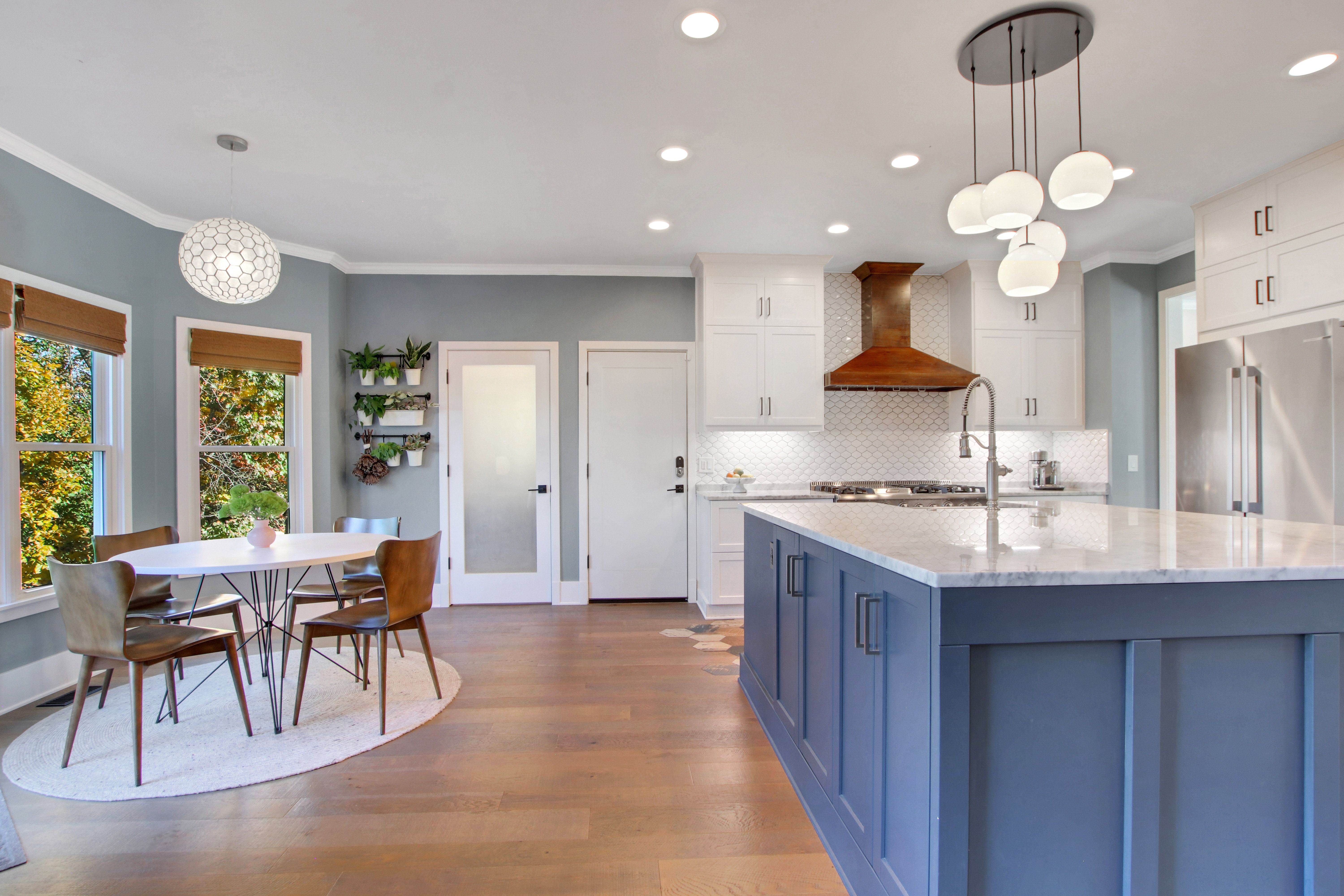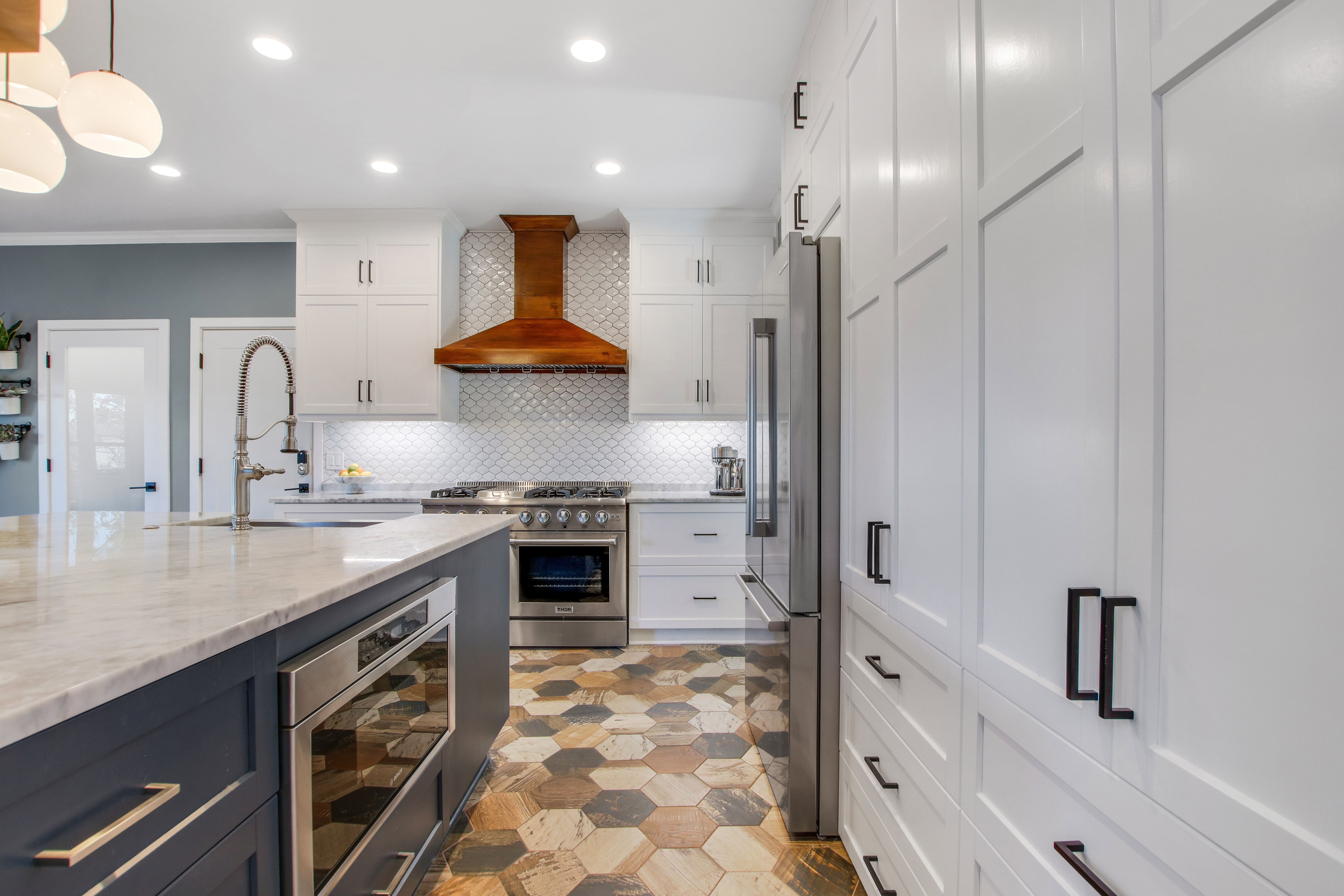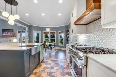 At the heart of the home, the chef's kitchen shines with a blend of European elegance and modern functionality - featuring a 6-burner range, Bosch appliances, statuario marble counters, custom wood hood, and a navy island that adds a pop of style.