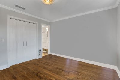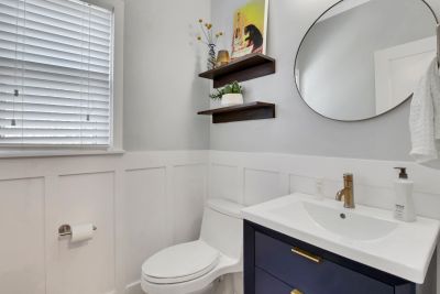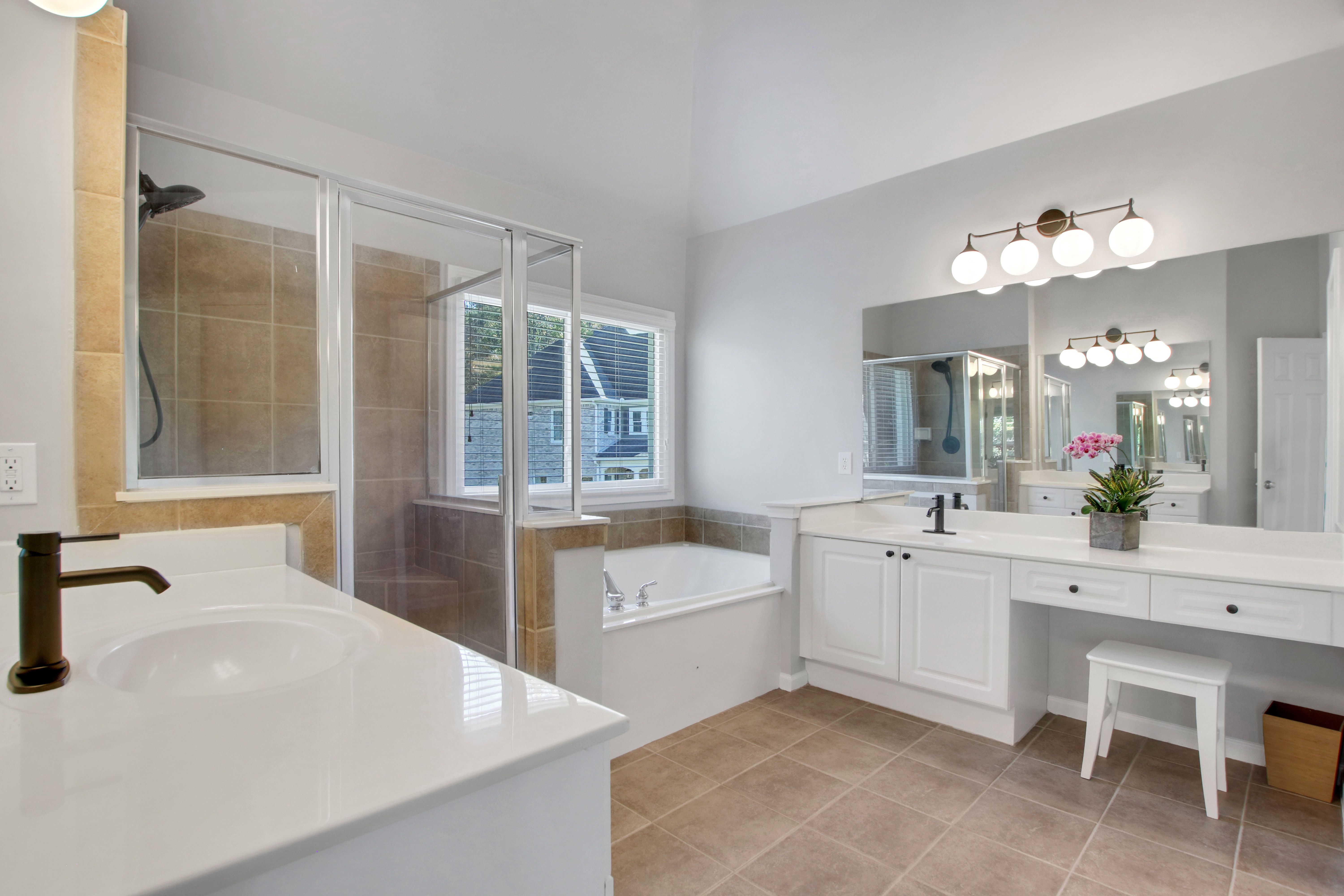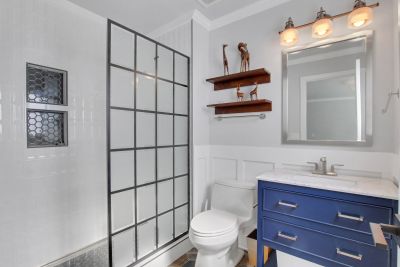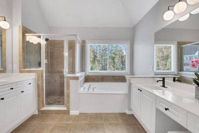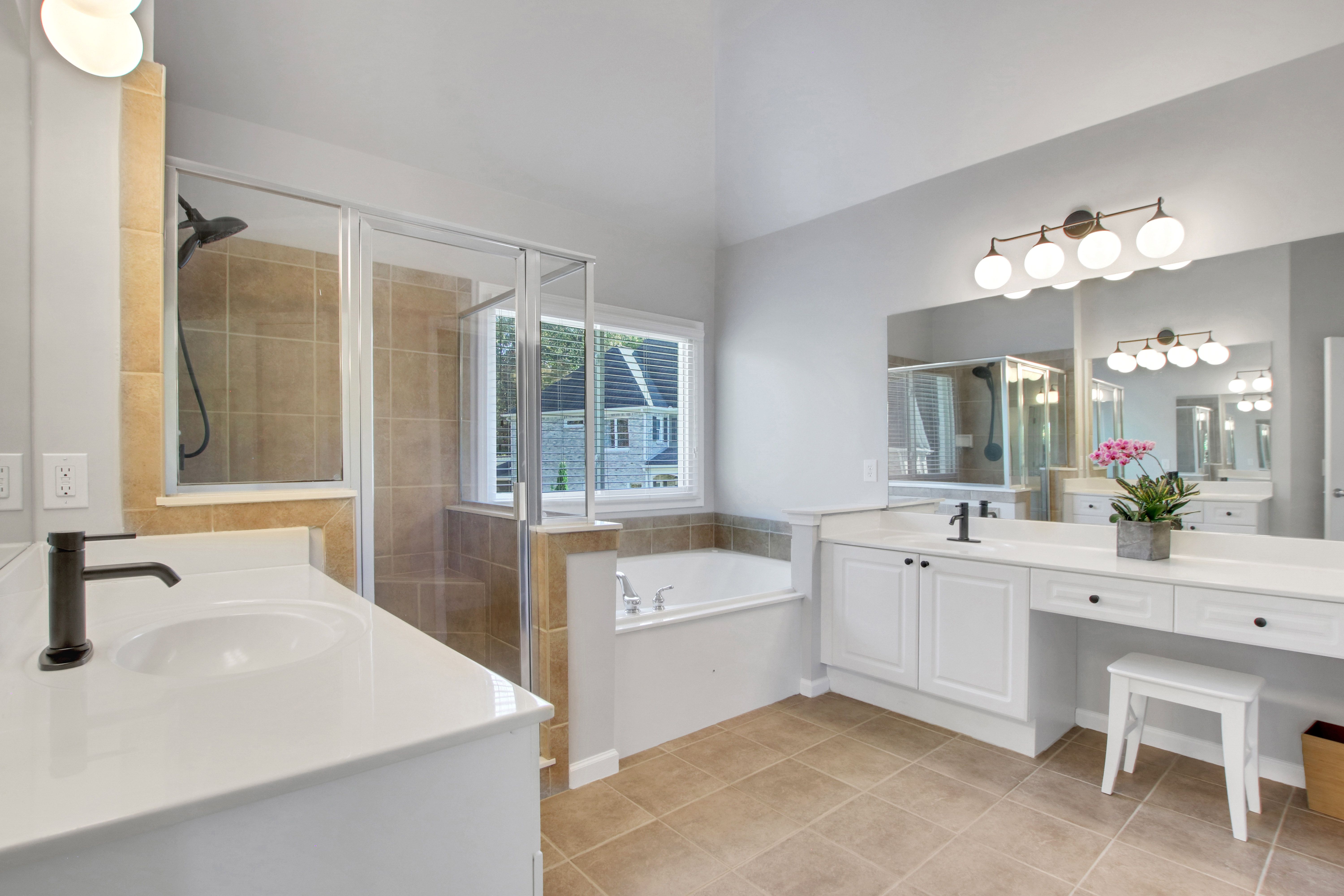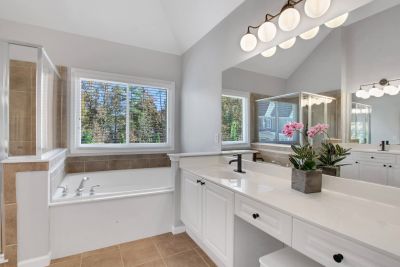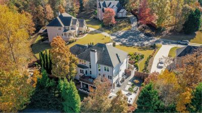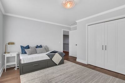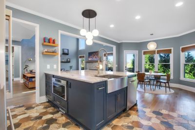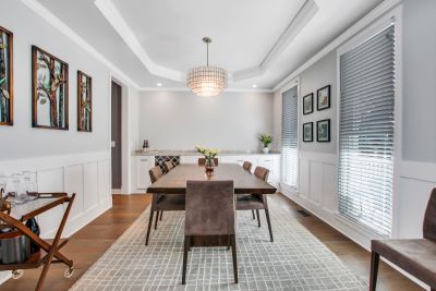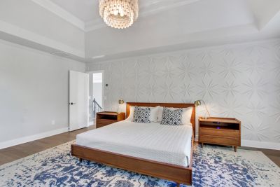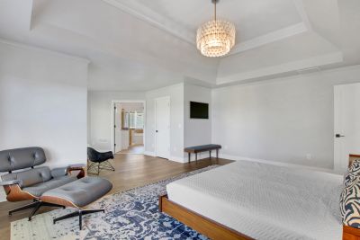 At the heart of the home, the chef's kitchen shines with a blend of European elegance and modern functionality - featuring a 6-burner range, Bosch appliances, statuario marble counters, custom wood hood, and a navy island that adds a pop of style.