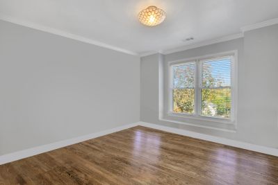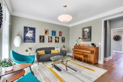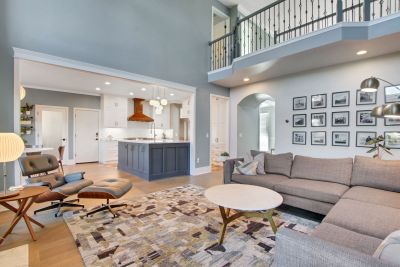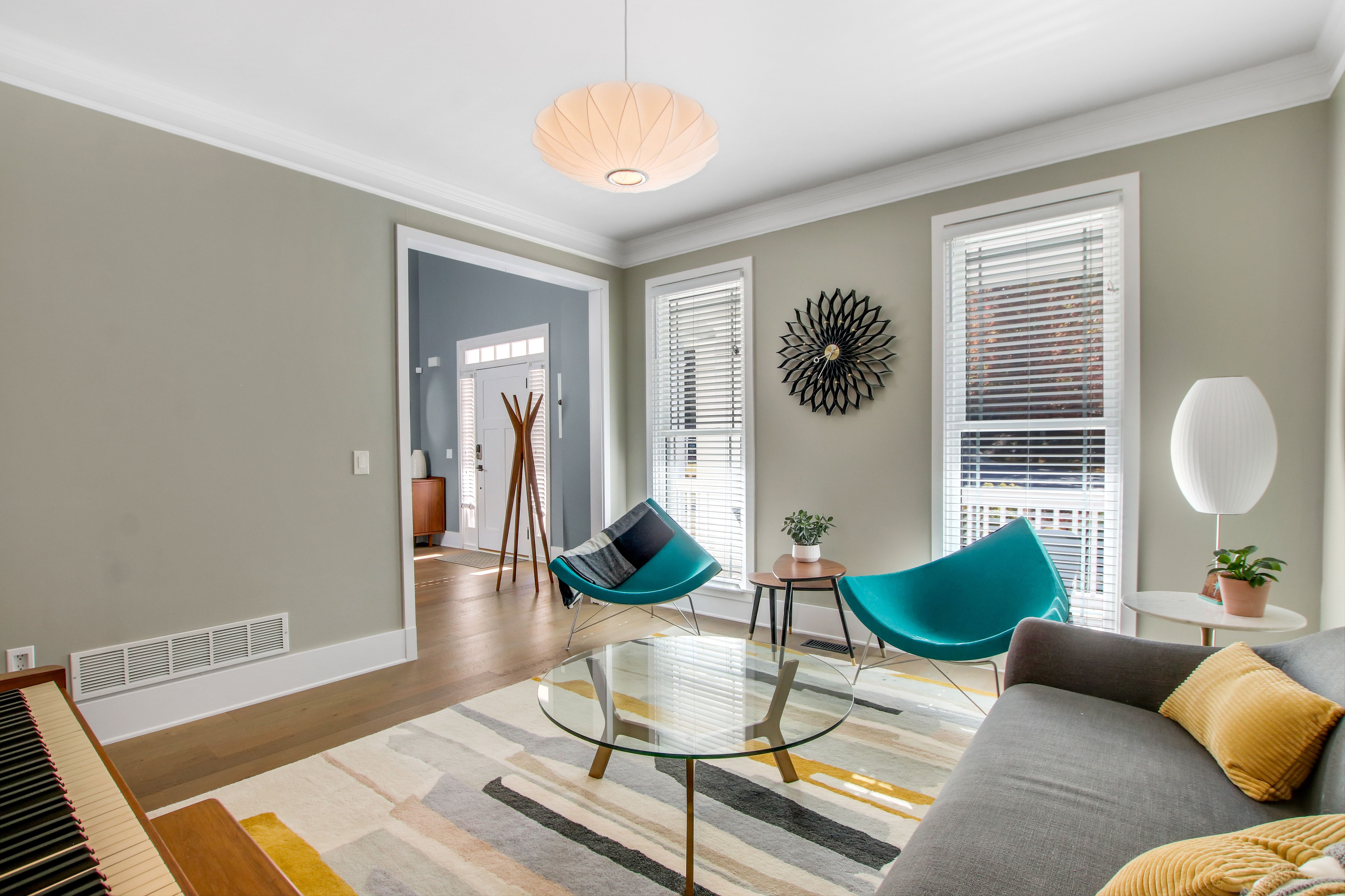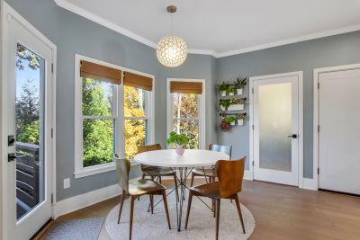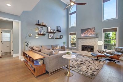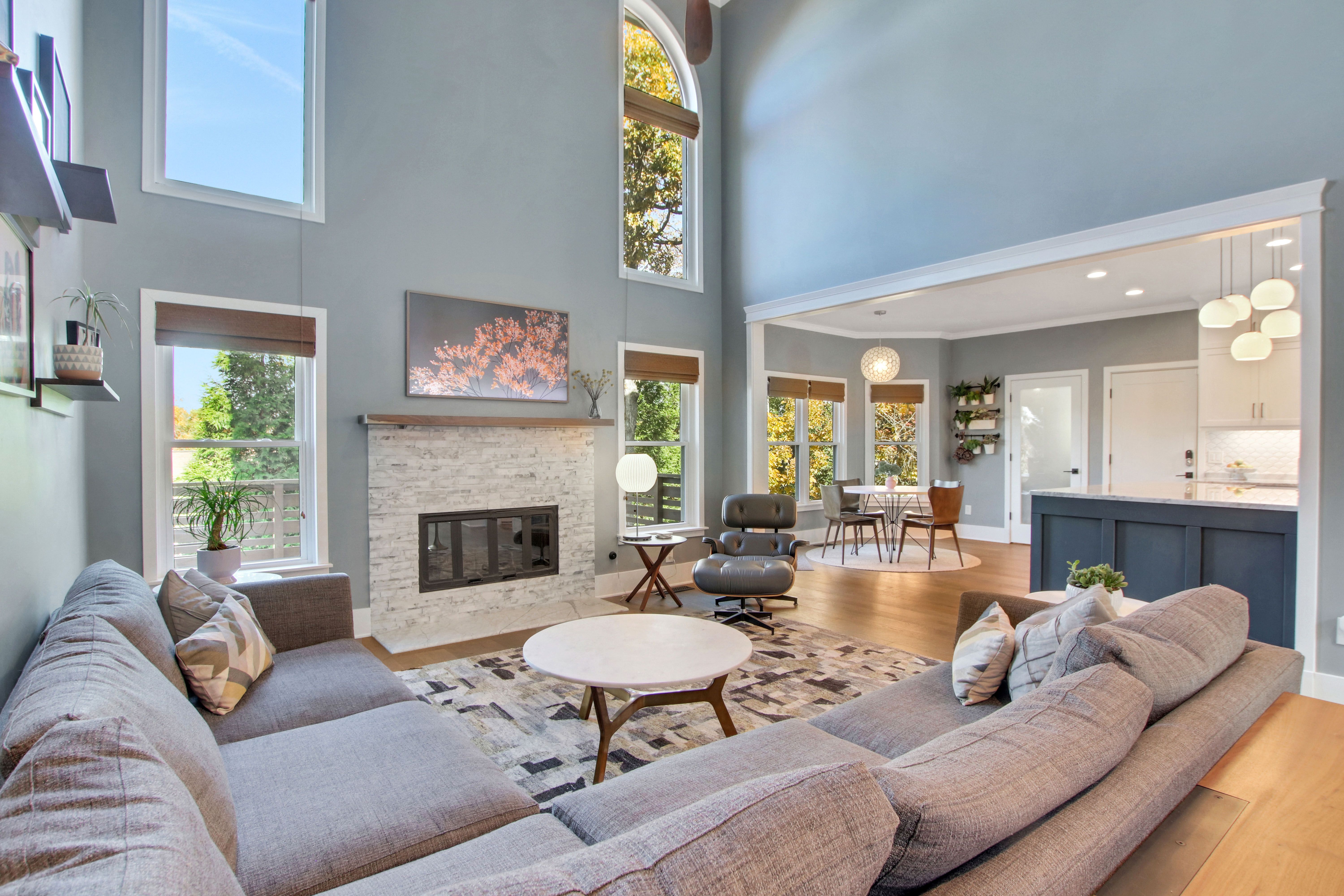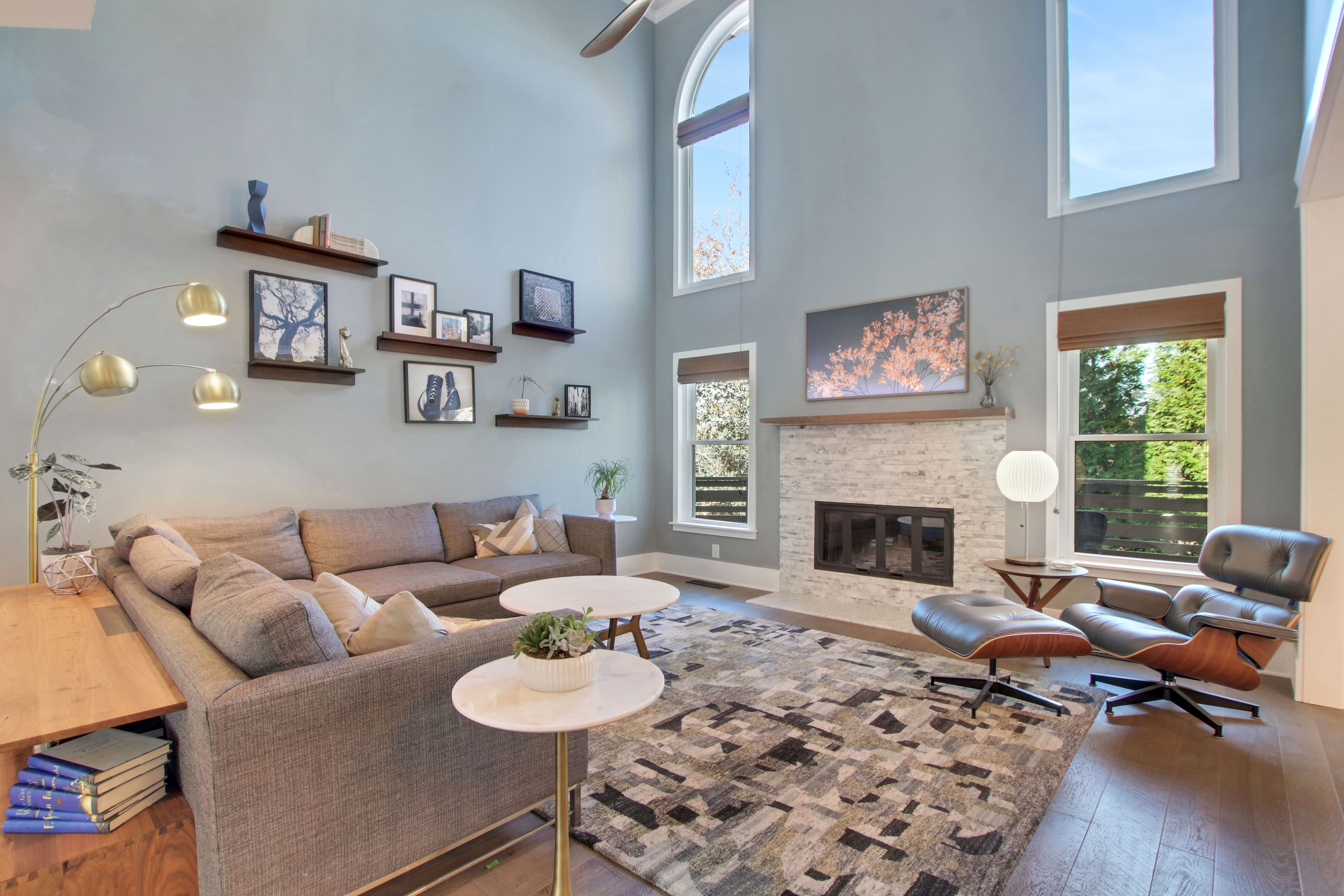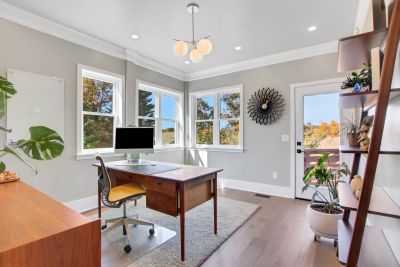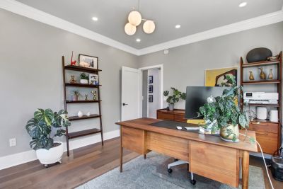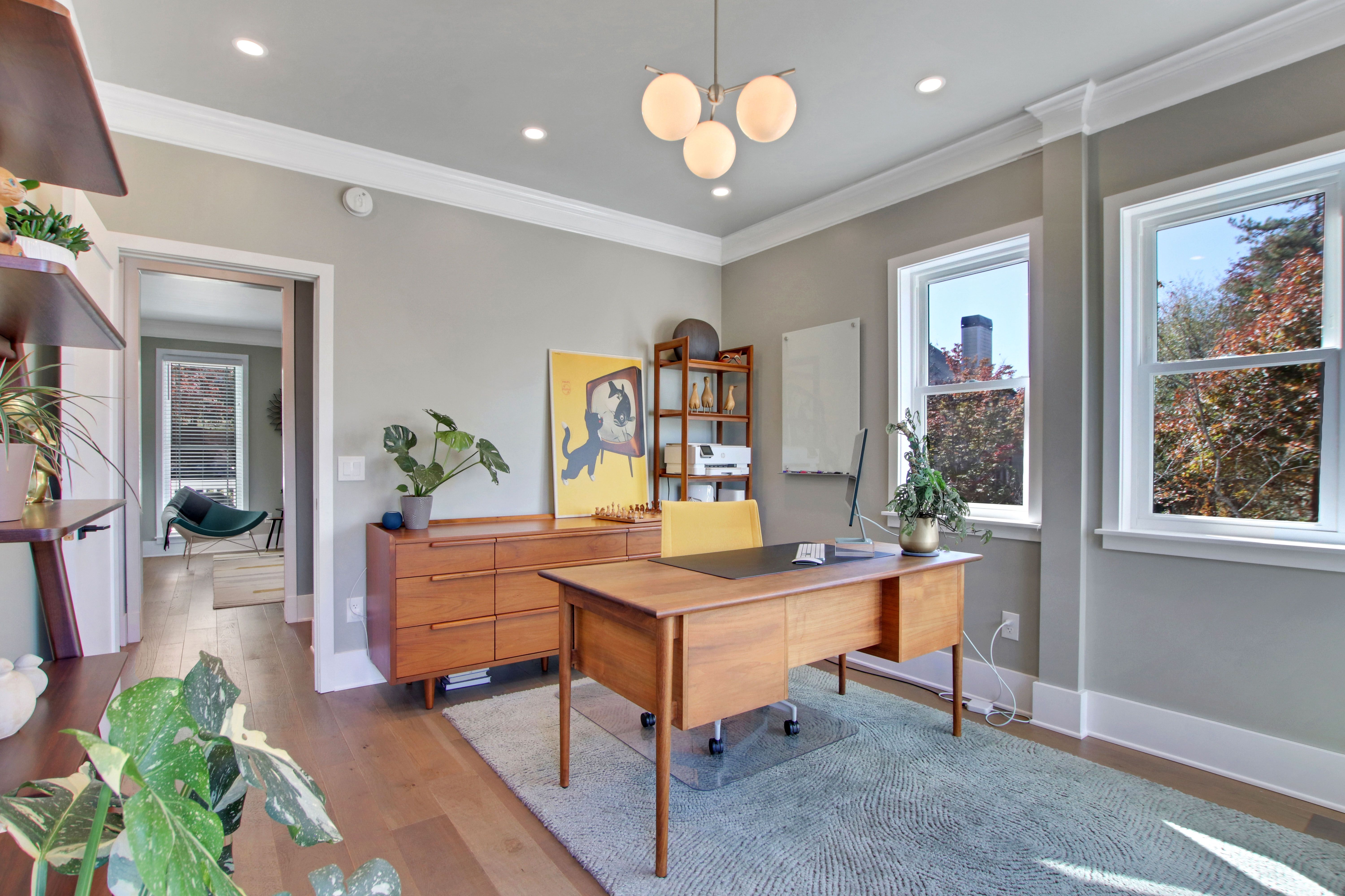 The living room and home office offers inviting space with beautiful natural light and modern, clean-lined design.